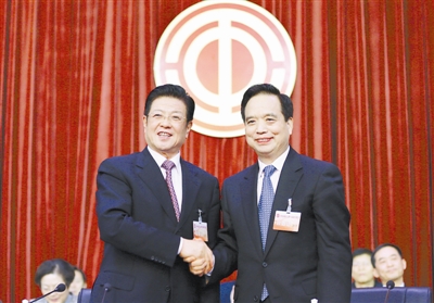 图为王兆国同志和李建国同志亲切握手。 记者 杨登峰 摄